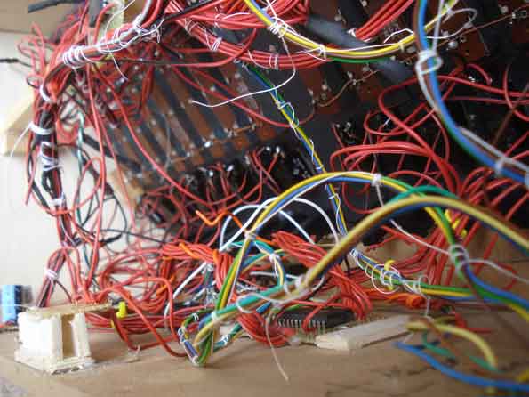 This was my first attempt to build an analog 16 step sequencer. Look, how messy it got. One row of faders and one row of dials for two channels of Control Voltage. One Gate Output and one Puls Output. The schematic I used for this sequencer was created by and can be found on the website of: