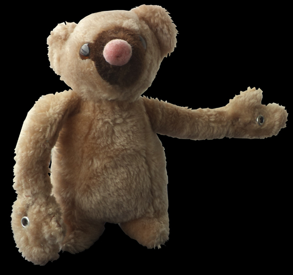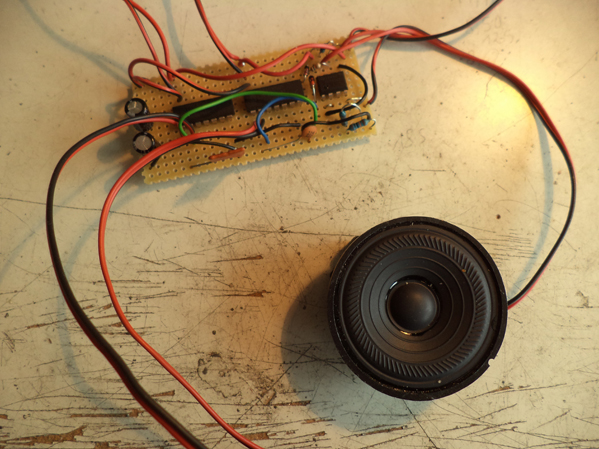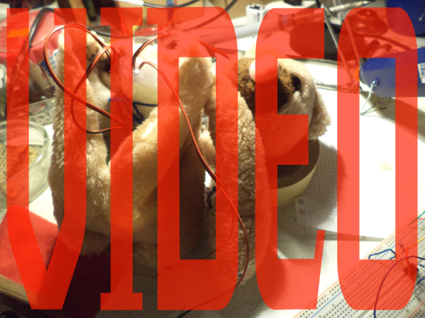 The CyBär IV uses tiltswitches in its hands. They trigger the sound. As long as the hands are up, the sound can be heard. Two photosensitive sensors control the pitch of two oscillators. The frequencies of these two oscillators are then added by diodes, giving a kind of frequency modulated sound.