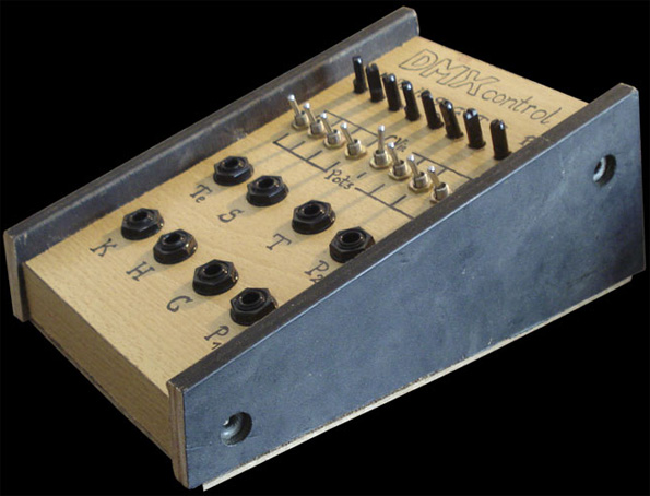 | This small but very useful box has been made to expand the possibilities of the famous Oberheim DMX drum machine. 8 potentiometers for manual adjustment, 8 Control Voltage inputs for external sources. The row of switches chooses between this 2 posibilities.