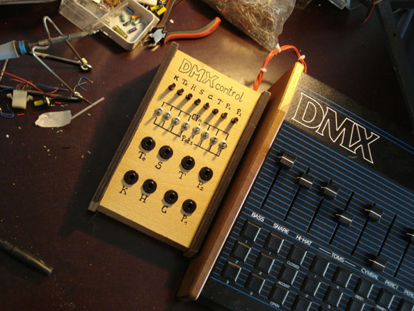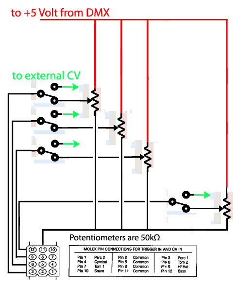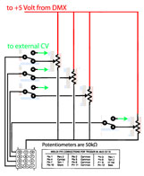 | To do your own DMXcontrol time and effort are little. The circuit is super simple. you need 8 potentiometers, I used 50kΩ, 8 switches and 8 sockets (mono). In my case the most difficult thing to solve was the CV input socket on the DMX itself. I could not find the corresponding plug. Therefor I had to make a different connector system. |