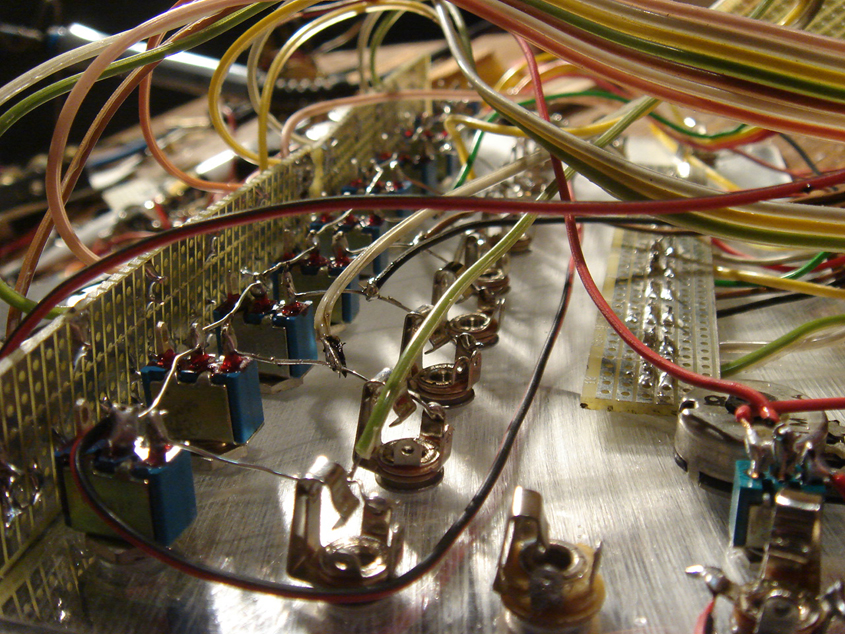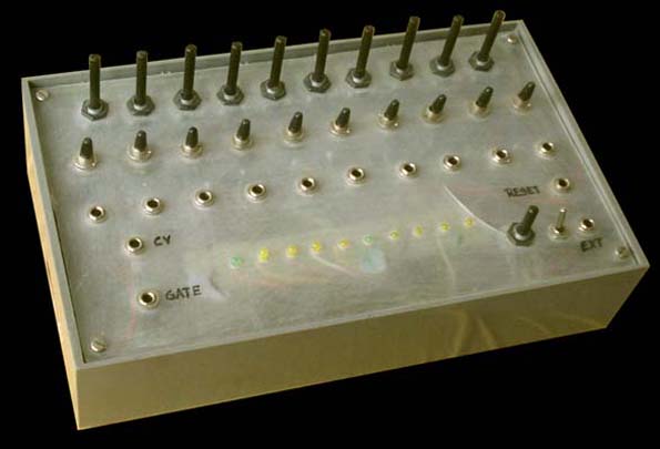 The first sequencer I ever built. A 10 step analog sequencer based on CMOS chips. A 40106 generates the internal clock signal. A 4017 counter distributes the clock. A switch for internal or external clock signal. To achieve a clean step seperated Gate signal, I use a 4081 Quad 2-Input OR/AND Gate.