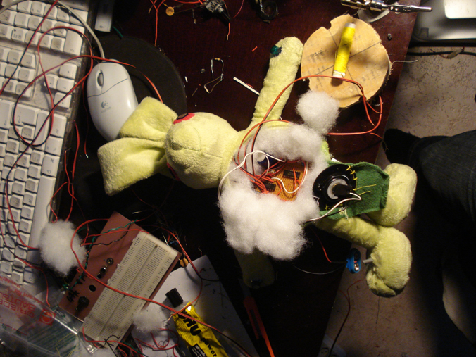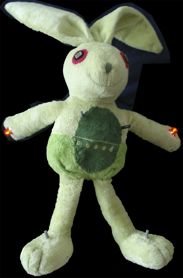 extHASE is a simple musical noise machine with a fluffy skin. The two eyes are replaced by lightsensitive resistors and in the hands there are Led`s. There are four potentiometers to set the working range and the pitch.