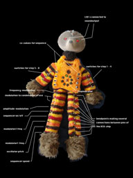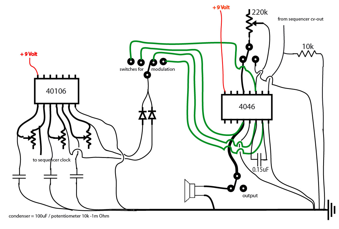 FreakyFox is rather complex. It is a single oscillator synthesizer with an analog 8 step sequencer and two squarewave modulators. In addition there are 10 points of circuit bending on the CMOS 4046 chip. The two modulators are generated by a 40106 chip.