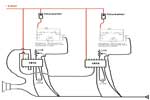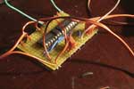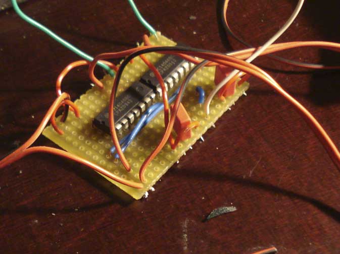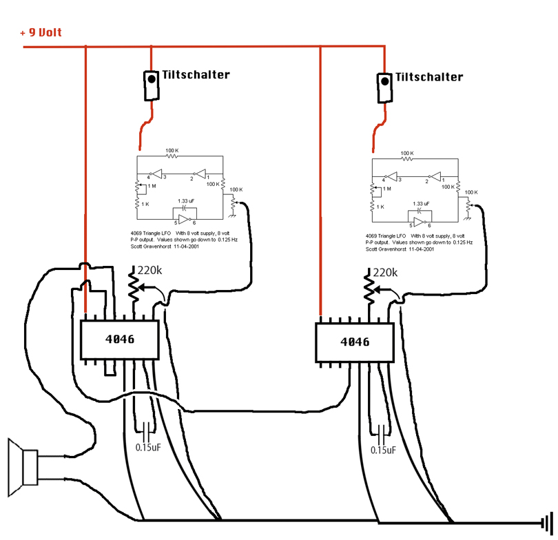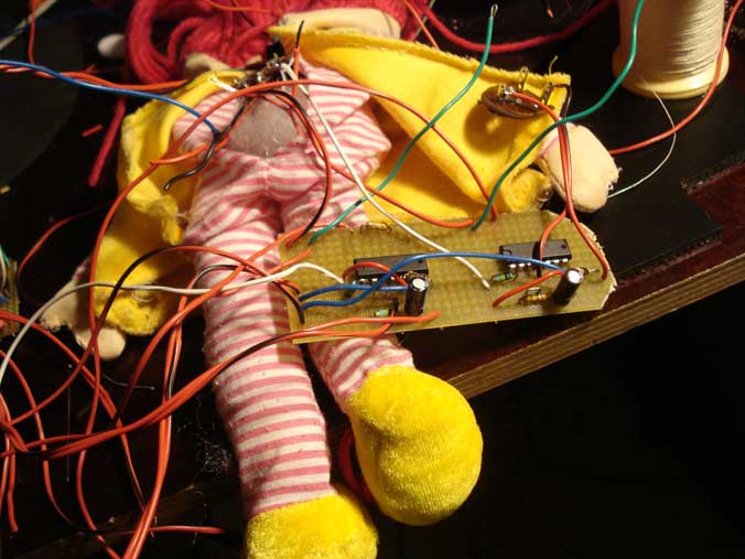 Two VCO`s with pitch control provided by two ramp generators. Potentiometers to define a pitch offset. The ramp generators are triggered by tiltswitches in the hands of the puppet. The VCO`s are ringmodulated by each other.