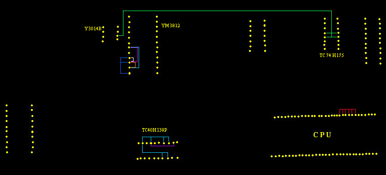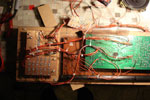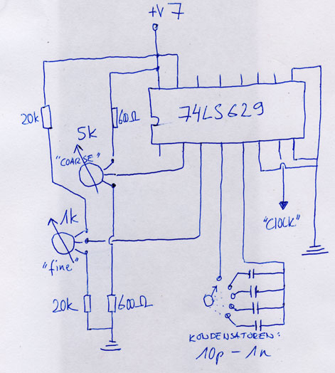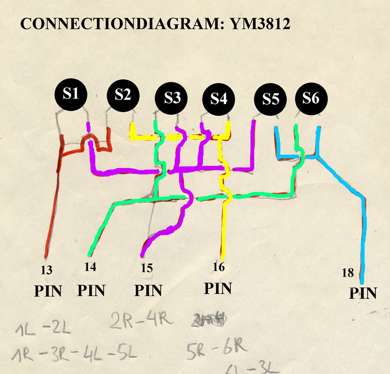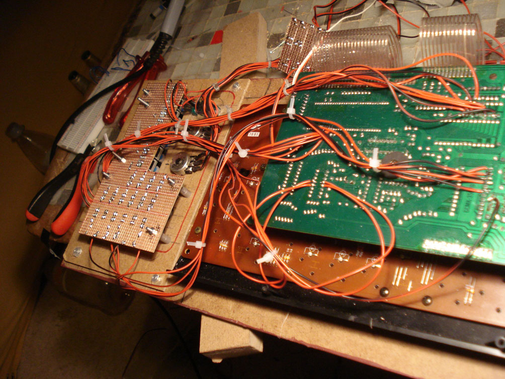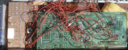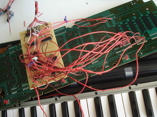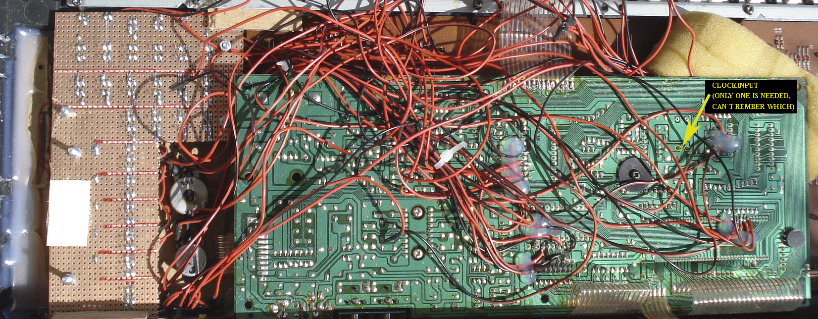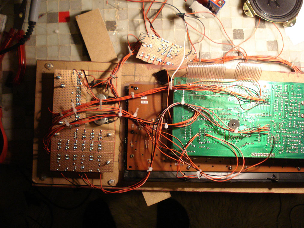 So now here some information on the Yamaha Pss360 keyboard. As mentionned it has almost the same technical architecture like the 470/560. Here I describe what I did with the 360 only. This family of keyboards has a synthesizer section. the parameters on that synthesizer are changed by sliders. this sliders are no potentiometers, but 5 position switches. It makes a nice effect to play a note and to change the sliders while still holding down the key. I wanted to have the changing of the sliders automated. I used a squarewave oscillator that drives a counter upwards in a loop (1, 2, 3, 4, 5, 1, 2, 3, 4, 5, 1, ...). The counter controls an array of analog switches. The pins of the switches are soldered to the points on the pcb, where the sliders would have closed the connections. It sounds like a kind of arpeggiator.