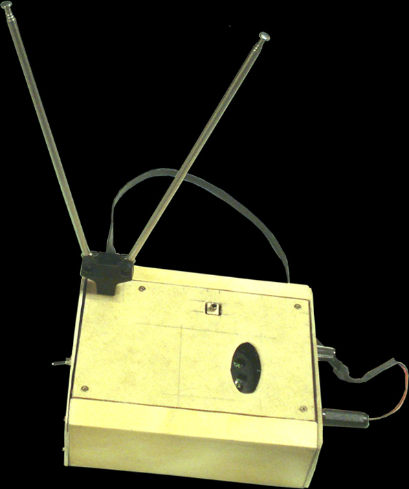 The Radiobird looks like a Theremin and it also has to be played in a alike way. But the Radiobird is something different and it is way more simple than a Theremin. It is nothing more but a radio with a feedbackloop from the output back to the input of the radios amplifier. This feedbackloop is normaly open and the two open ends of the circuit are connected to the two antennas. The instrument is played by touching the two antennas. The conductance of the human skin acts as connector and closes the feedback loop. |