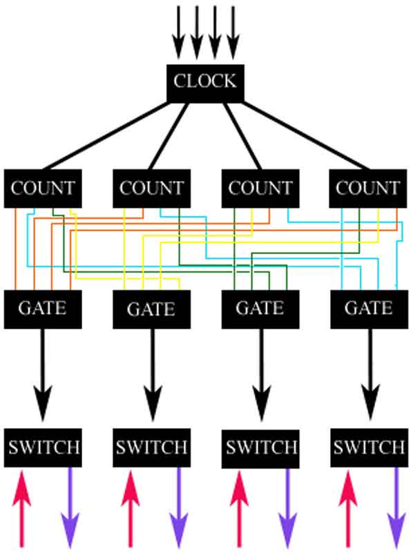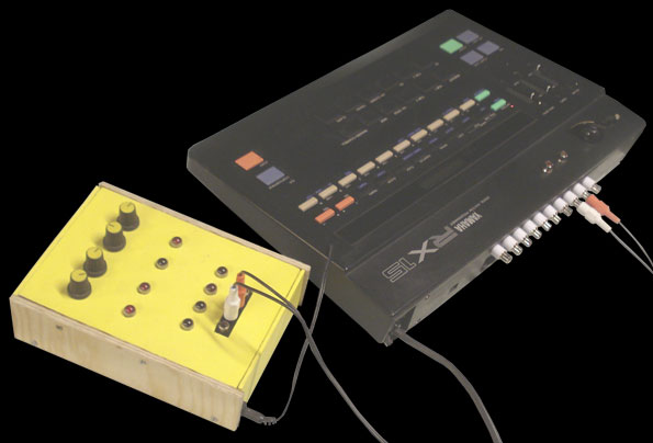 The Raindrops Modul is a random generator. Its output reminds me on a slightly fall of raindrops. The module can generate 4 independend impulses. These impulses close and open 4 gates. As example I use it to remotely control the pads of a Yamaha RX15 drum machine. A impuls generator consists of a clock generator, a binary counter, 3 AND gates and finally a switch. Each clock generator drives a binary counter. The speed of the clock can be set by a dial. The binary counter divides an incomming clock or signal like this: output 1: Clock divided by 2 output 2: Clock divided by 4 output 3: Clock divided by 8 output 4: Clock divided by 16 The first output of the binary counter of line 1 takes control over one input of the first gate of line 1, changing its state continously from high to low (1/0). The second output of the binary counter of line 2 takes control over the other input of the first gate, changing its state continously from high to low (1/0). But on a different timebase. If it happens that both Inputs show a high state the same time, than the output of the gate also shows a high state. This output of the first gate feeds the one input of the second gate of the line 1. The third output of the binary counter of line 3 feeds the other input of the second gate of line 1. Again if high states are seen at both inputs of the second gate, the signal is passing through the second gate. The output of the second gate feeds one input of the third gate and the fourth output of the binary counter of line 4 controls the other input of gate number three of line 1. As bevor, the signal only can pass the gate if both its inputs show a high state. Because all binary counters have a different clock speed, it is unpredictable when a signal will pass through all three gates. This is repeated for the other three lines the same way. Take a look at the schematic for a better understanding. |