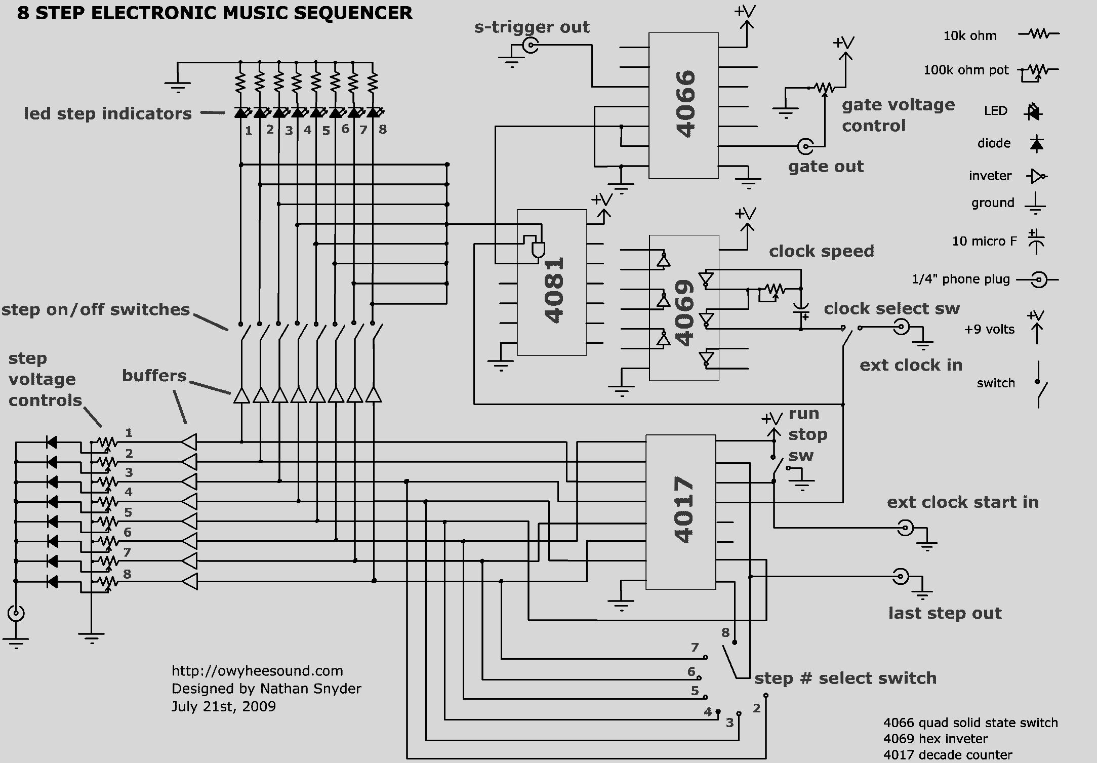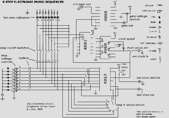 I used a 4017 counter. A 40106 generates the internal clock signal. I can choose between internal or external clock signal. For a clean step seperated Gate I used a 4081 Quad 2-Input OR/AND Gate. See the schematic of Nathan Snyder: |