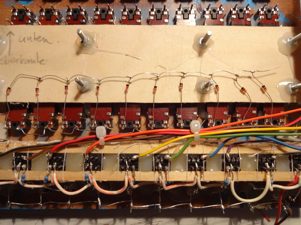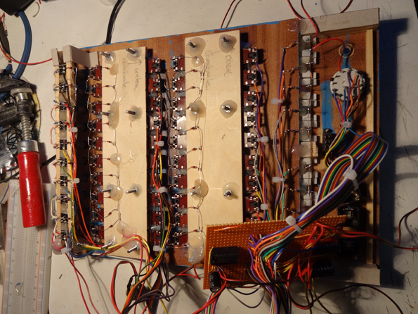 This is the third sequencer I built. A dual analog 10 step sequencer. Two rows of faders and one row of switches to mute a step. Two Control Voltage outputs and one Gate output. The reset is made by a Dial.